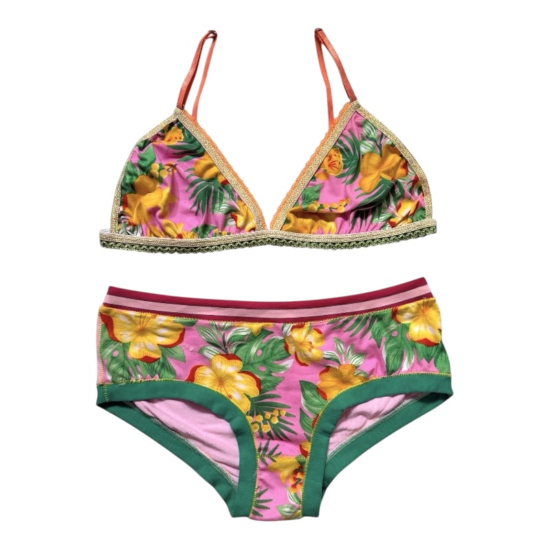 Ensemble aux assemblages de matières et couleurs (40% coton, 30% élasthane et 30% viscose) dont la culotte ne présente pas d’élastique, aussi bien au niveau de la taille qu’au niveau des cuisses et le soutien gorge triangle s’adapte à chaque poitrine grâce à l’élasticité du tissu. Agréable au toucher et confortable à porter.
